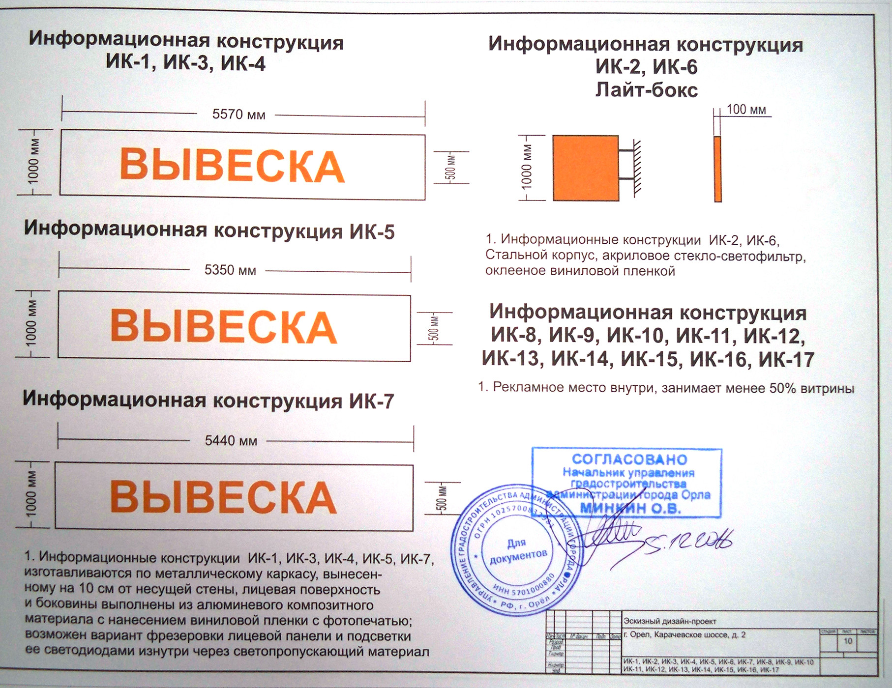 Как правило, в большинстве муниципальных образований, документы на согласование информационных конструкций (ИК) и вывесок подают в "Управление архитектуры и градостроительства", а на рекламные конструкции (РК) в "Департамент имущества и земельных отношений". Иногда эти функции на себя берёт администрация района, на территории которого планируется установка РК или ИК.