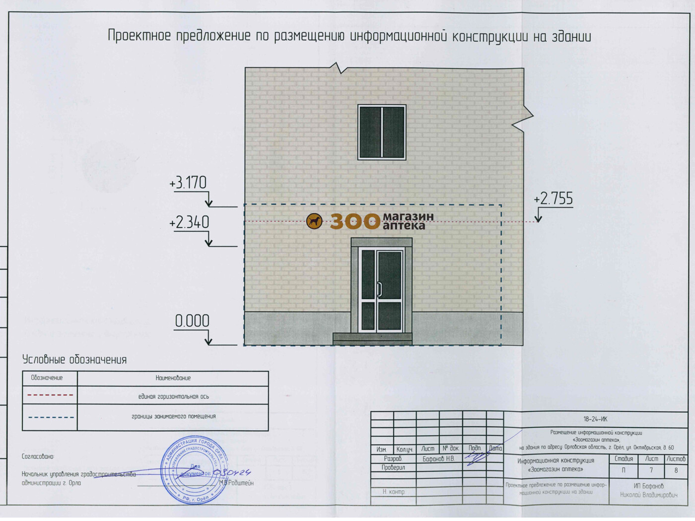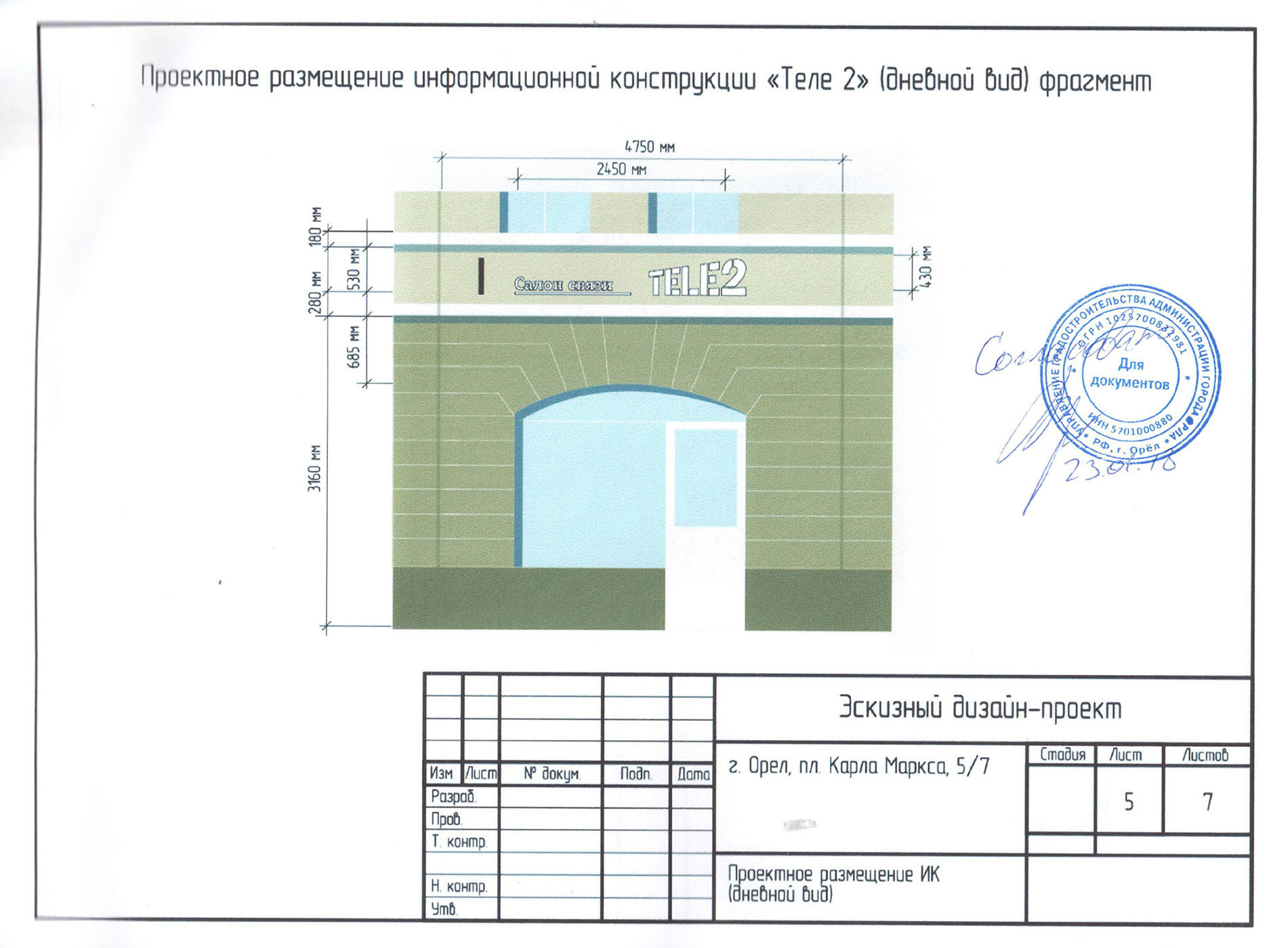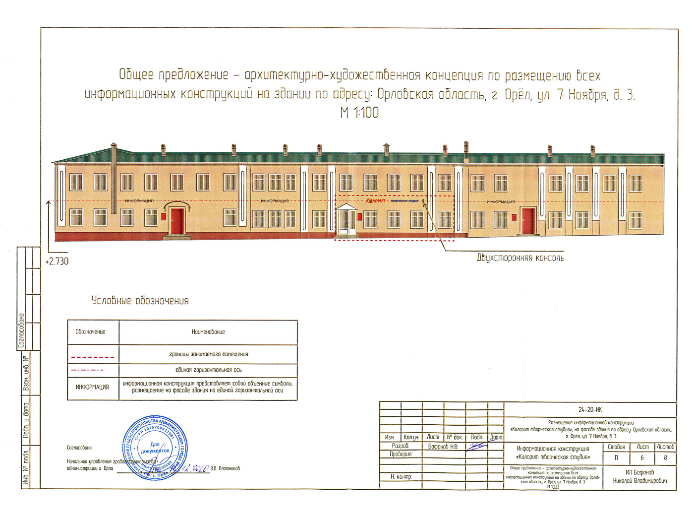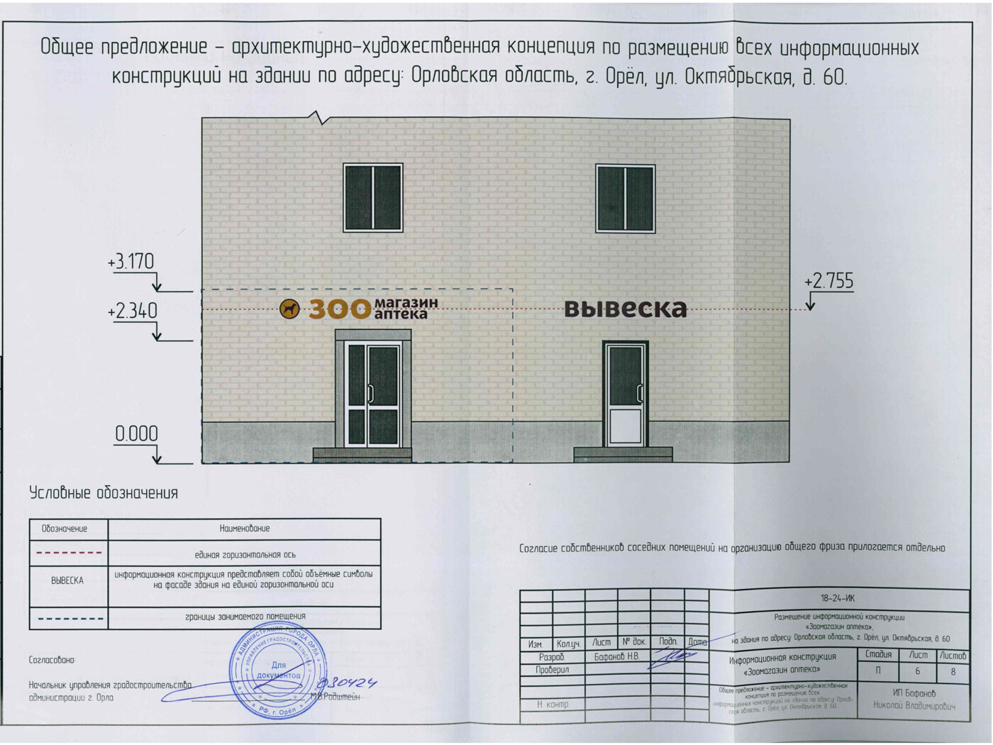 Информационная конструкция -размещается над входом или в непосредственной близости с ним, не содержит сведения рекламного характера и ограничена в размерах и техническом исполнении.